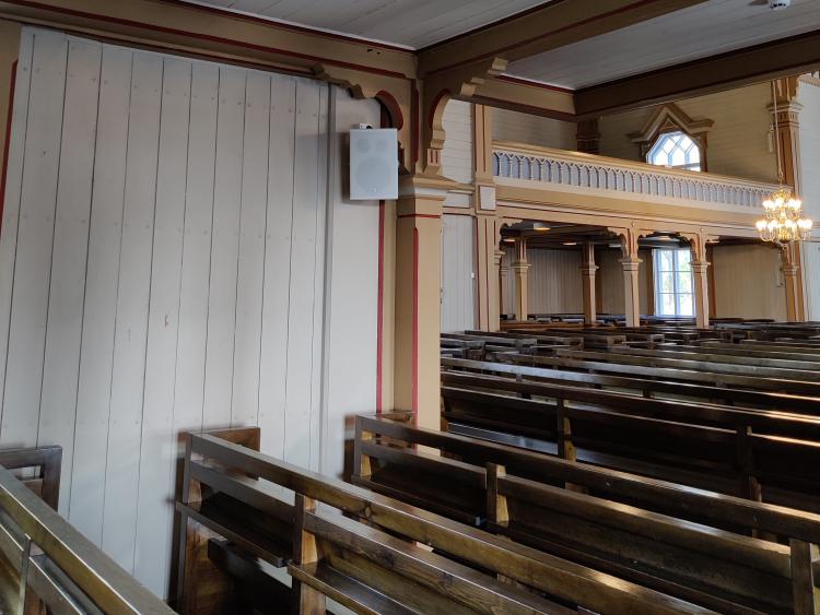 Kirkkosalin äänentoistosta huolehditaan PanBeamin pilarikautinjärjestelmällä, jonka pääkaiutinparia tuetaan kahdeksalla apukaiuttimella (ks. yllä). Lisäksi järjestelmään kuuluu kaksi JBL:n EON-sarjan subwooferia, joista tilaan saadaan tarvittaessa tukevasti bassoa. Mainittujen lisäksi joukko aktiivikaiuttimia on valjastettu muun muassa monitorointikäyttöön.
