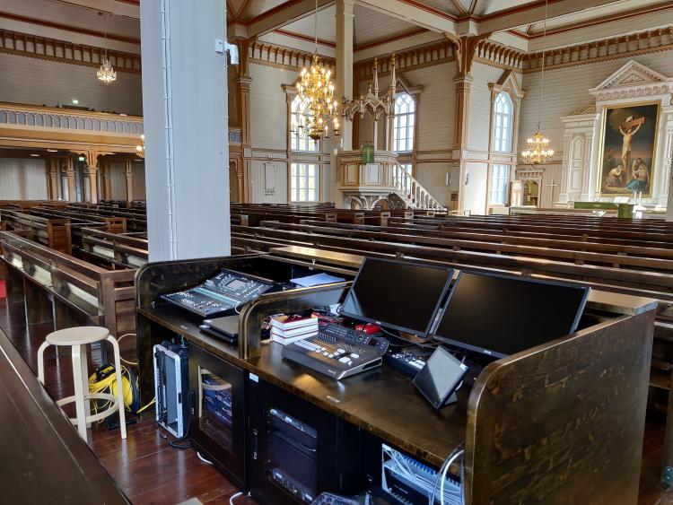 Studiotec toteutti kirkkokohteiden valtavirrasta poikkeavana ratkaisuna kirkon päälaivan takaosaan hallintapisteen, josta voidaan esimerkiksi konsertin aikana ohjata äänentoistoa sekä miksata ja lähettää videota (kuvassa alla).