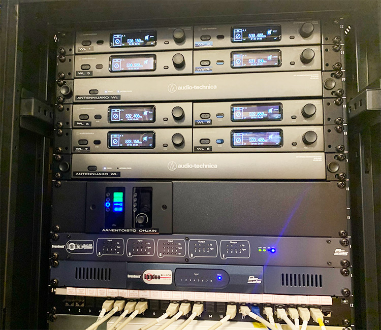 Nyman luonnehtii hankittua äänentoistoratkaisua erinomaiseksi. Salin pääjärjestelmänä palvelee sähköisesti suunnattava, pilarityyppinen Pan Beam PB 248 -linjasäteilijä, jota tuetaan saman valmistajan viive- ja matalataajuuskaiuttimilla sekä etufilleillä. Prosessoinnista huolehtii BSS Soundweb BLU-100.
