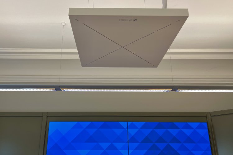 Nyt tunnelma on koko lailla sama, osallistuipa tapahtumaan salissa tai sen ulkopuolella. Ja koska Rakli ei halunnut tehdä kompromisseja äänenkään suhteen, puhe poimitaan Sennheiserin kahdella älykkäällä Team Connect Ceiling -kattomikrofonilla (kuvassa yllä).