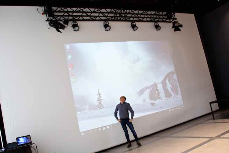 ”Maijansalin yleisöpohjaa pystytään virtuaalisesti laajentamaan esimerkiksi projisoimalla salikameroiden kuvaa videotykkien kautta ulos saman kerroksen digitaaliseen seinäpintaan”, Nylander esittelee.